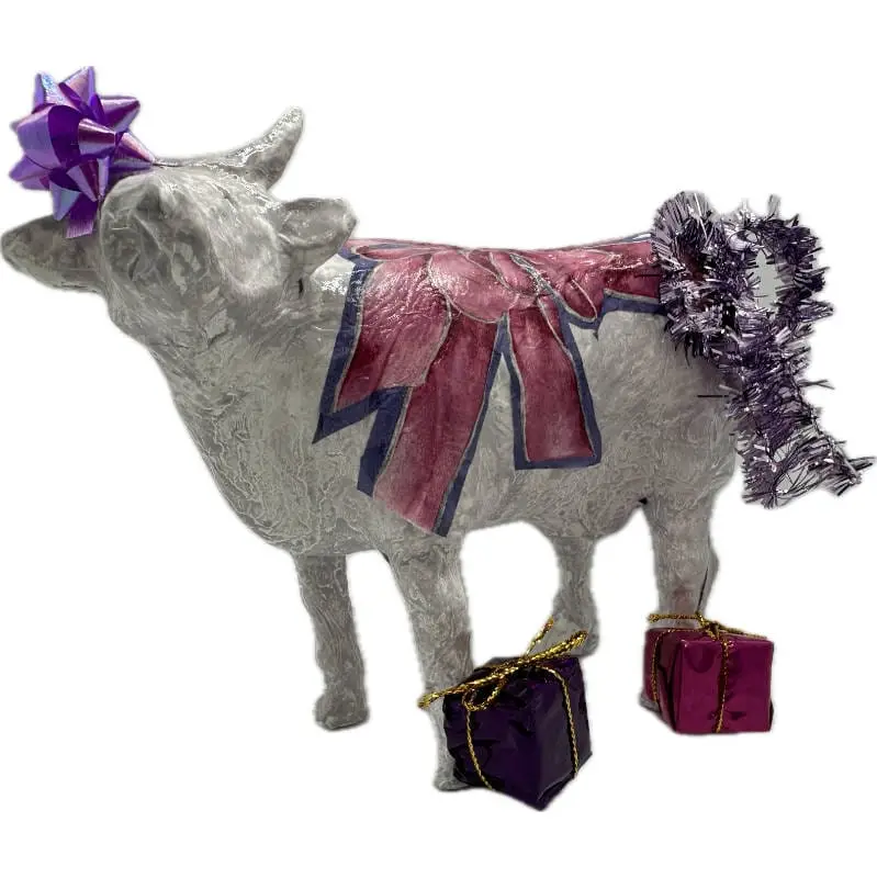 La COW aux Cadeaux tire son nom d’un jeu de mots amusant combinant le terme « cow » (vache en anglais) avec sa capacité à apporter à chacun ce qu’il souhaite. Chaque détail de cette création est pensé pour évoquer papiers brillants et rubans.
